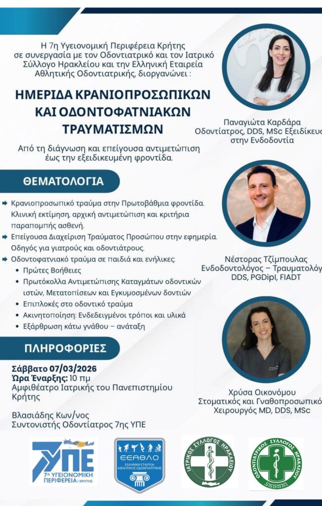 Ημερίδα Κρανιοπροσωπικών και Οδοντοφατνιακών Τραυματισμών – Από τη Διάγνωση και Επείγουσα Αντιμετώπιση έως την Εξειδικευμένη Φροντίδα , 07/03/2026, Αμφιθέατρο Ιατρικής του Πανεπιστημίου Κρήτης